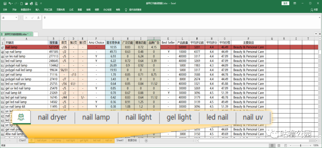 做法是:把竞品的反查收录词全部放在一个Excel表格里,根据整理得出的词根,分别筛选所有包含这些组合词根的长尾词放在不同工作表,分别整理刚才获取到的反查数据。尔后再综合看这一组关键词的搜索量、是否有广告排名再去确定我们应该选哪个词根埋在listing里和打广告。