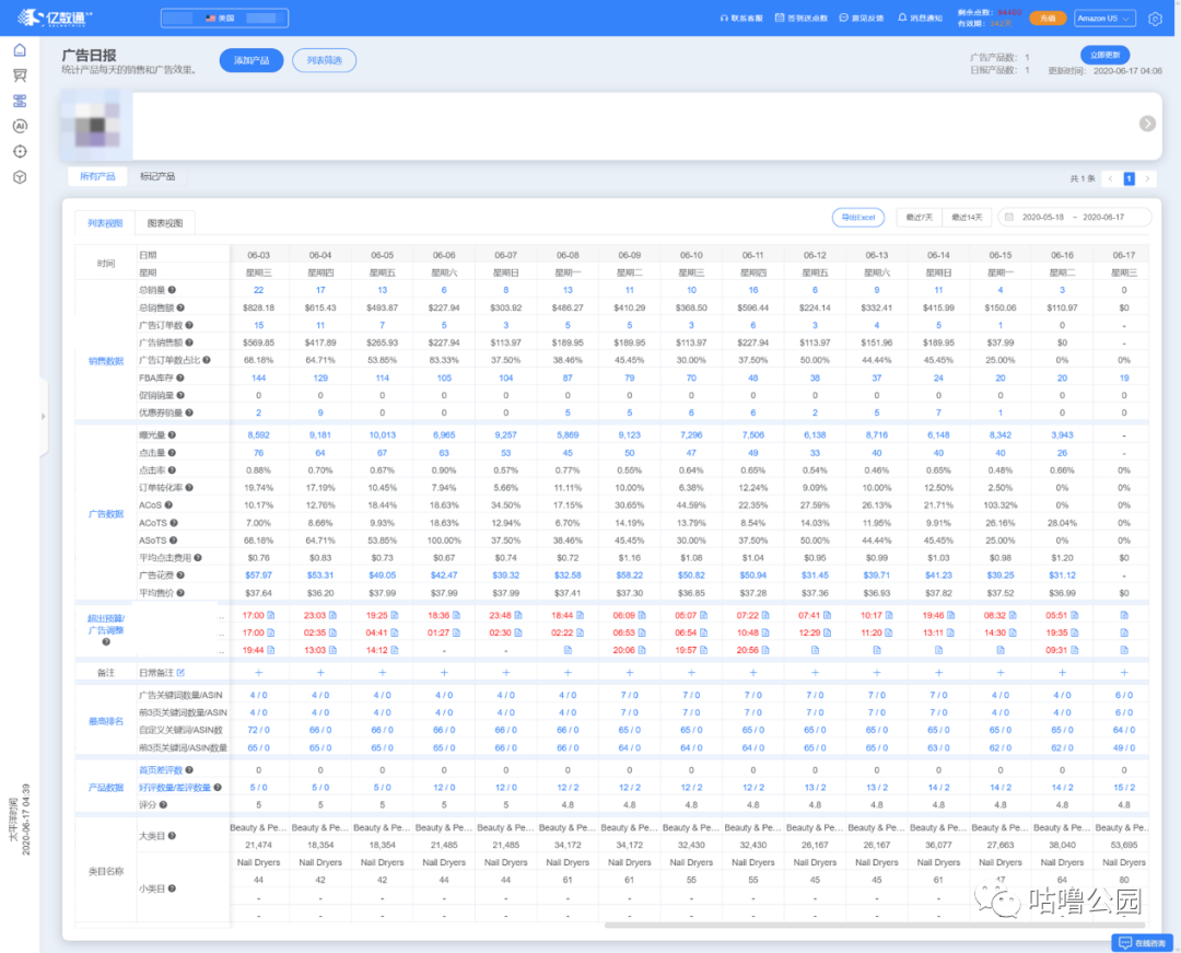 首先,我们要对比的是前14天每一天的订单的轨迹情况,曝光量的增幅度,转化率是否有问题,因为点击率一般情况不会太大的变化,如果点击率少于0.5%,我们都会继续想办法去不断去优化图片。如果发现曝光量下降了,我们会去广告预算是否烧完,因为要判断广告的流量是否用起来。如果广告预算烧完了,那我会去看究竟是哪个时间点就烧完了预算,这样可以判断是预算的问题,还是竞价策略的问题。如果预算没烧完或者很久才烧完,那我会看广告日报里面当天体现在前三页的关键词数据有多少个,如果前三页的排名都没有或者比之前少了,那表明核心的关键词都没有抢到流量,可能被竞争对手抢走了核心关键词的排名位置,这个时候需要进行明确的竞价策略和预算的调整。