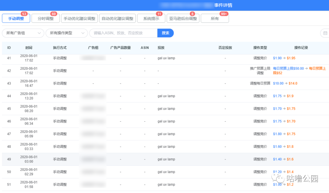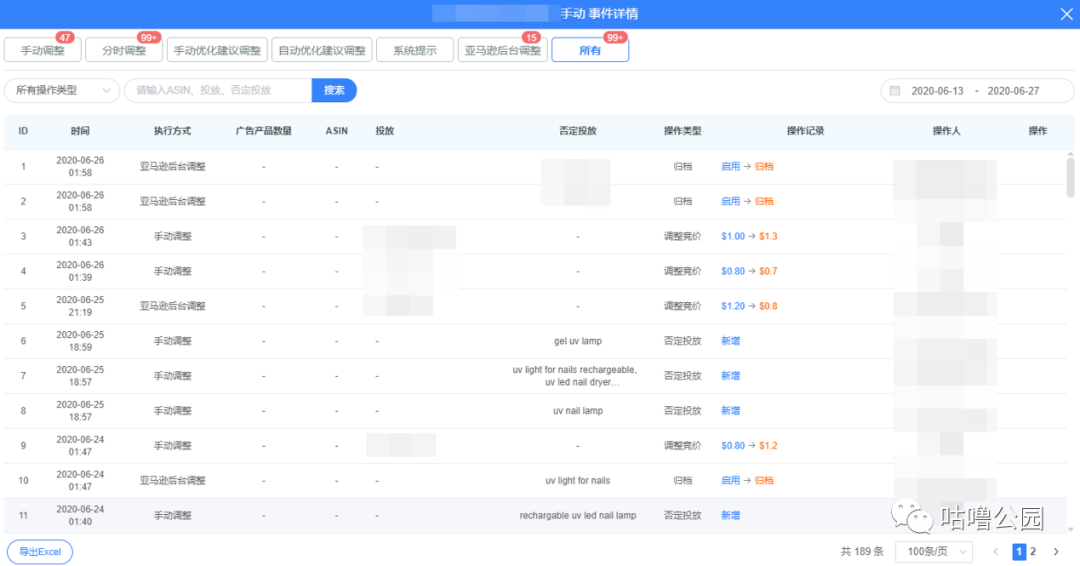 需要跟踪运营的广告思路是否灵活,以及是否能及时调整广告,所以我们日常了解运营细节的方式就是看广告日志。亿数通的广告日志功能让我们清晰地看到运营是否有灵活应用了分时调价和智能优化规则去管理广告、是否有勤快地监督广告的运行。而且当有成功案例出来时,我们通过广告日志又可以追溯回这个广告完整的打造历程。