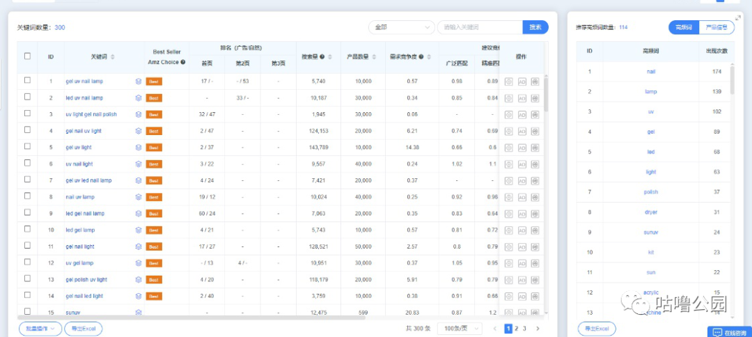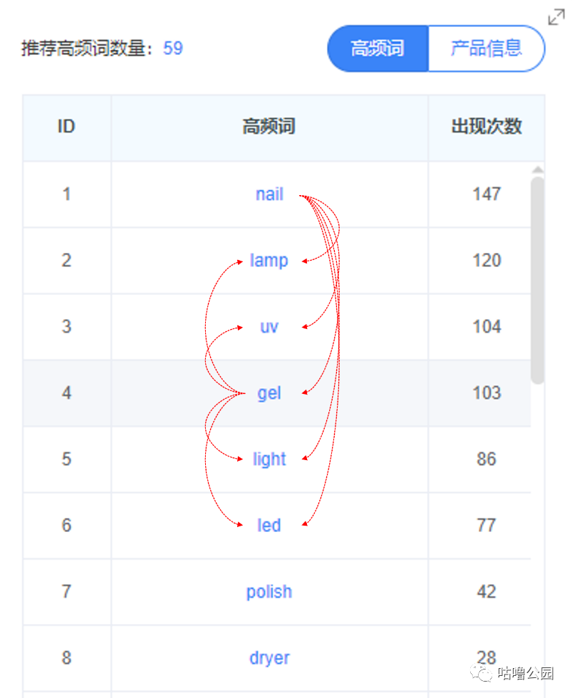 分析多个竞品的反查数据,找出出现频率高的单词,即根词。使用不可缺少的根词,与其他根词进行两两匹配,组成词根。我们认为词根最好是只由2~3个单词组成,而且是高频出现的词,于是从反查竞品数据里,我们找到这类产品的词根分别是:Nail lamp, nail uv, nail gel,nail light, nail led ,gel lamp,gel uv, gel light, gel led。