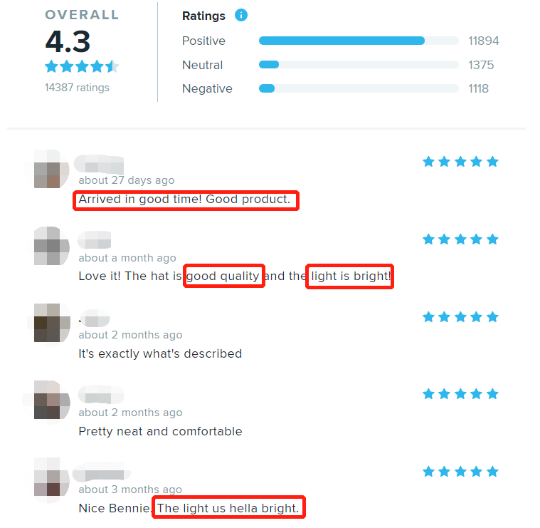 和上面2款旺季热卖产品相比,上图这个款式的Beanie帽产品获得了很多“soft”、“warm”相关的评论,产品材质、保暖的特性非常适合更加寒冷的天气,帽檐的一圈短毛也增加了温暖的感觉。在保暖这方面,产品给予了用户满足预期的体验;即使产品使用的是普通的直发物流,但较好的物流时效也给了用户额外的“惊喜”。