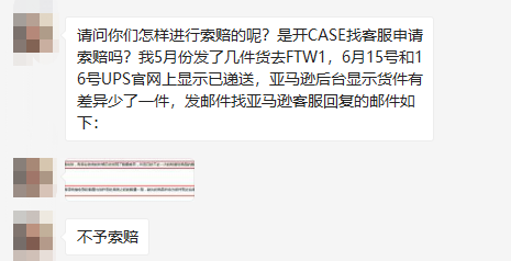 但有的卖家就没有那么幸运了!有卖家表示自己的货件少了一件,亚马逊客服回应是不予索赔。