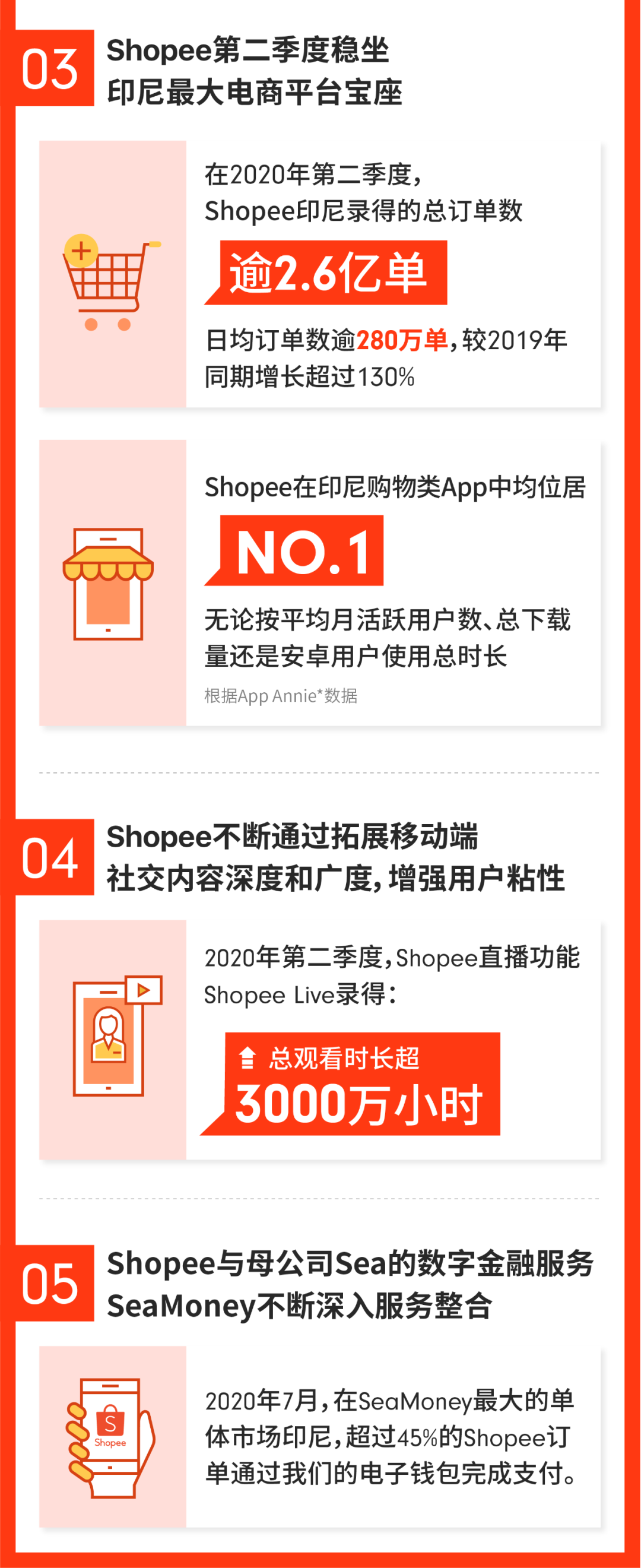 2020年7月,在SeaMoney最大的单体市场印尼,超过45%的Shopee订单通过我们的电子钱包完成支付。
