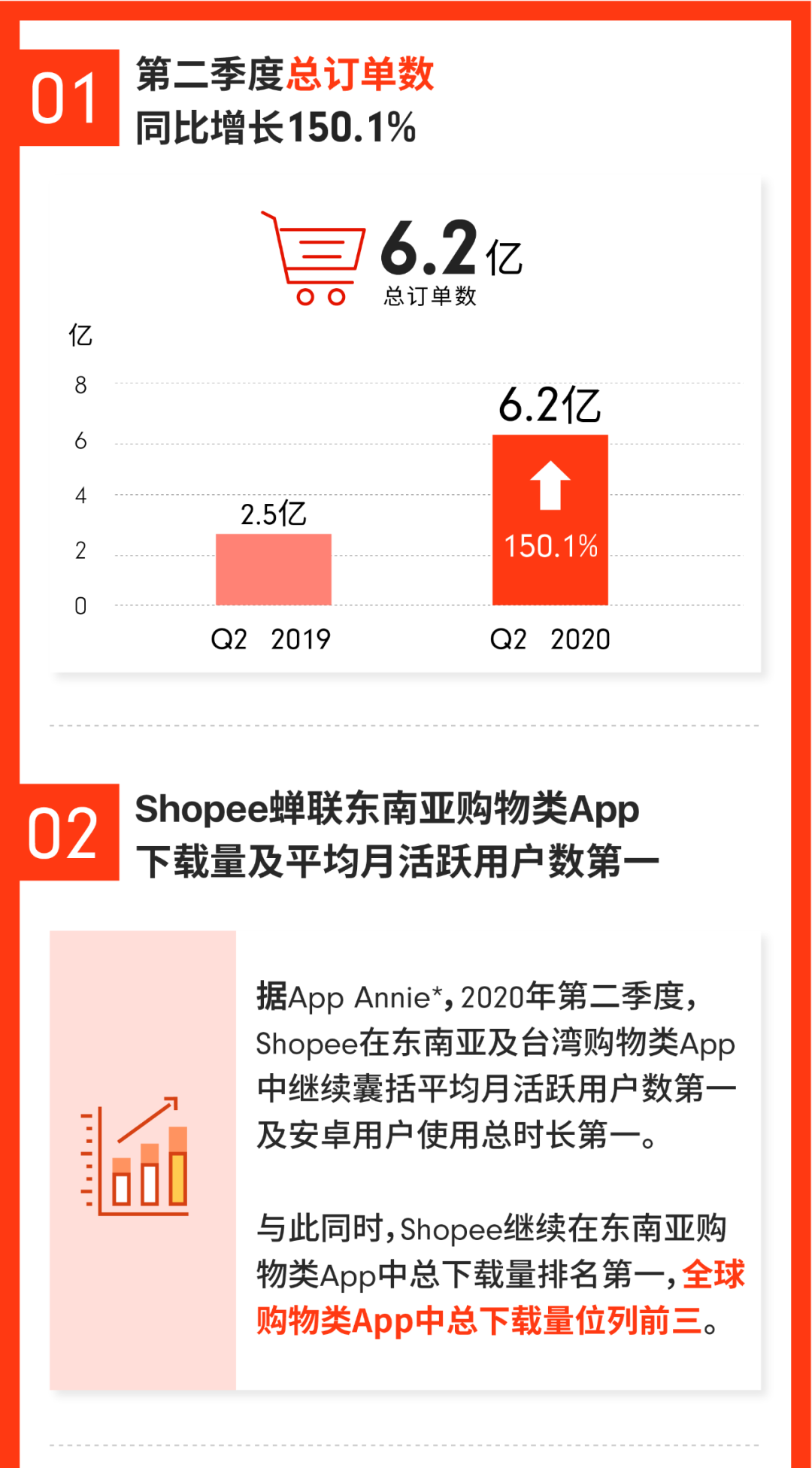 Shopee 2020年第二季度成绩发榜!Shopee把握市场变化所带来的增长机遇,实现强劲增长,稳居东南亚与台湾市场领先地位:总订单数同比增长150.1%。