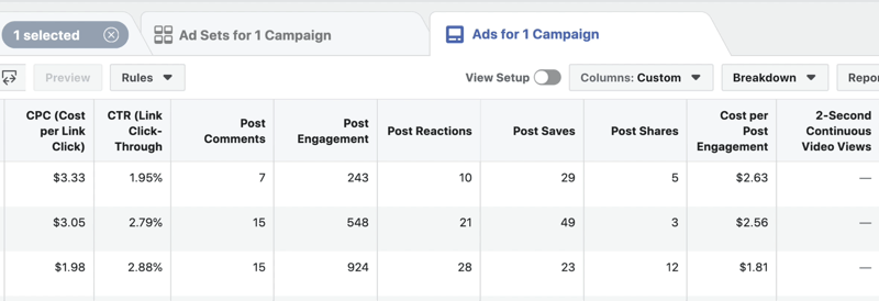 从人们的评论到他们点的赞,可以看到他们与每个广告的互动,这些数据将帮助你更好地了解你的帖子是否引起粉丝的共鸣。如果你的广告评论为零,那么可能受众对你分享信息的方式没有兴趣,这时可以试着改进下文案写作技巧;相反,如果受众疯狂地分享你的广告,则可以继续为你的社群使用这种类型的广告内容。创建自定义报告不仅可以帮助你快速分析Facebook广告效果,你还可以与同事、经理和客户快速共享信息。