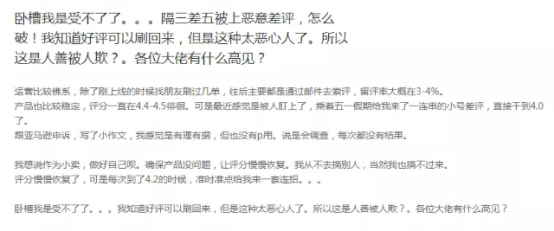 无独有偶,有卖家同样遇到恶意差评的,其在论坛哭诉到: