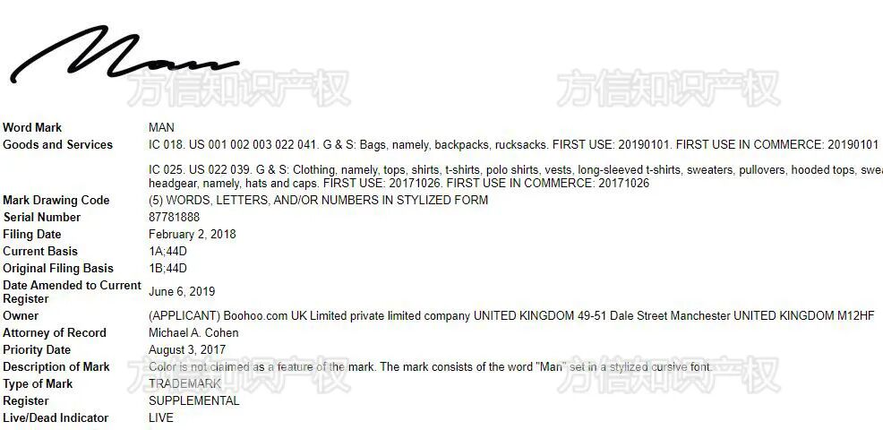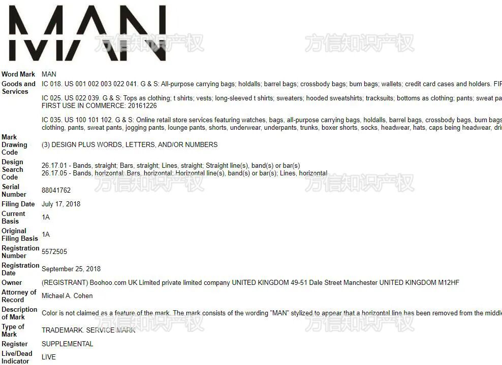 第二个拥有 MAN 商标的公司 Boohoo.com ,这是英国的一个男装品牌。其中两个商标也是以 MAN 字样去设计的,其中一个商标是草书版的 MAN 。