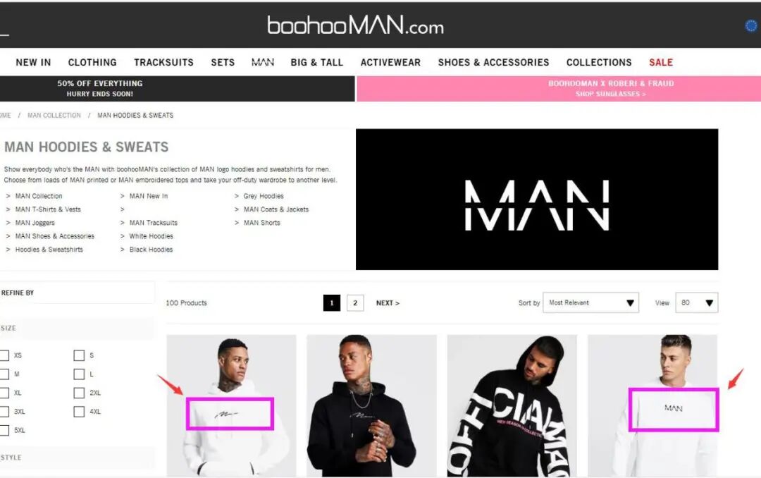 对此,要注意服装上印的 MAN 字眼是否和 Boohoo 公司的一致。如果一致可能会有侵权风险。