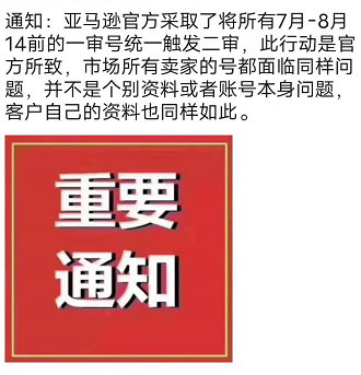 该消息表示:亚马逊官方采取了将所有7月-8月14前的一审号统一触发二审,此行动是官方所致,市场所有卖家的号都面临同样问题,并不是个别资料或者账号本身问题客户自己的资料也同样如此。