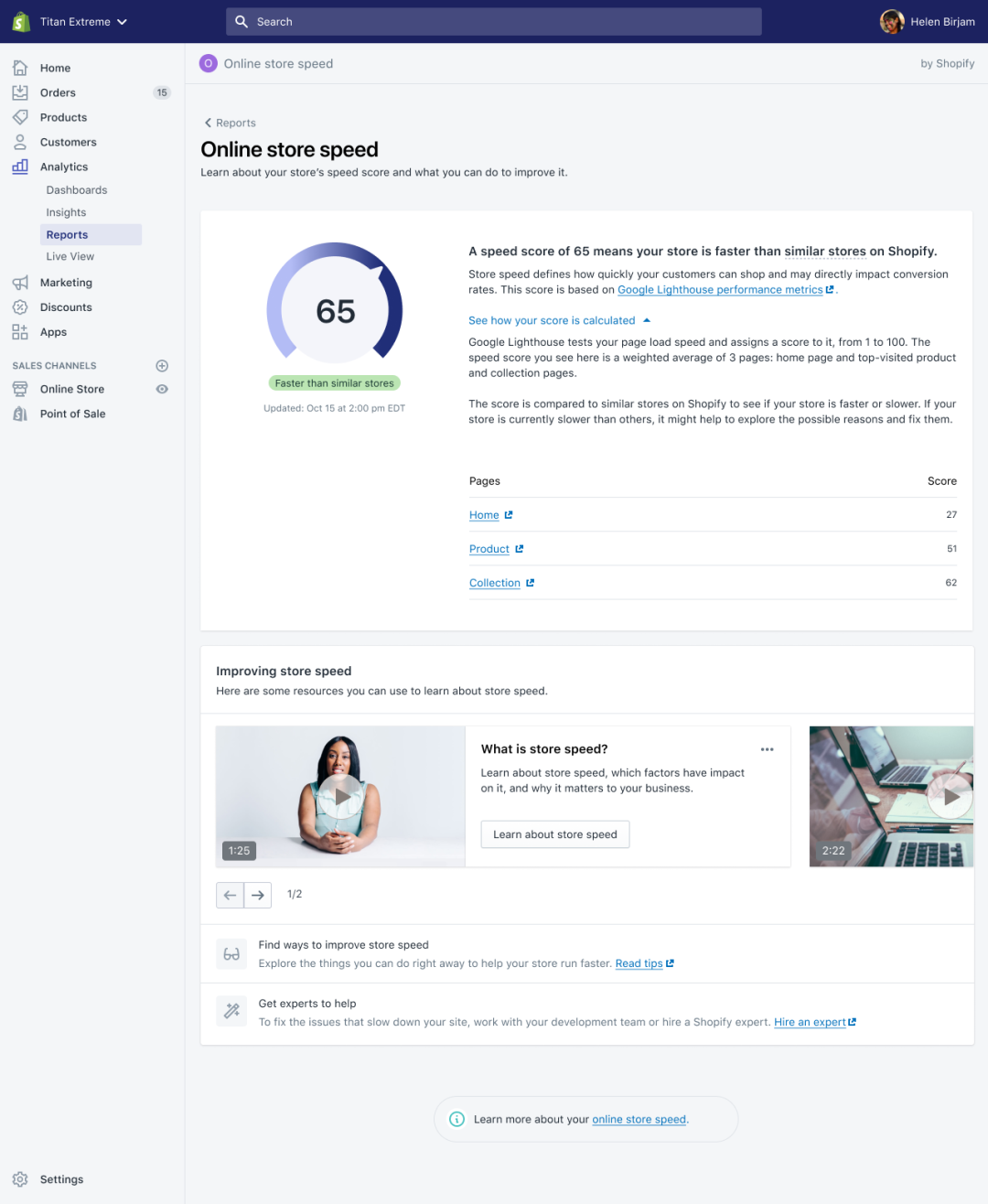 速度就是你的一种竞争优势。因此,我们一直致力于如何让你的商店自动保持快速的响应速度。这份新鲜出炉的报告正是我们正在构建的众多资源中的第一个成果,可以帮助你更轻松地了解你的在线商店的运行状况,以及可以采取哪些步骤让商店响应得更快。很快将会有更多的工具横空出世。准备好了吗?现在就开始行动吧 ,马上登录你的 Shopify 商店后台即可查看!