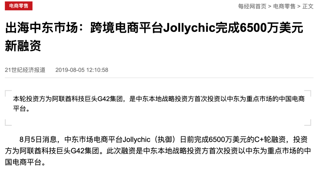 如深耕中东多年的Jollychic,在阿联酋、沙特均设有站点,自备后端派送团队,2019年拿下6500万美元投资,2019年7月Jollychic成为首批获得阿联酋支付牌照企业。此前,Jollychic正式宣布旗下支付平台执御支付Jolly Pay获得了沙特本地支付牌照,这使Jolly Pay成为 GCC 国家唯一持有该牌照的外资企业。