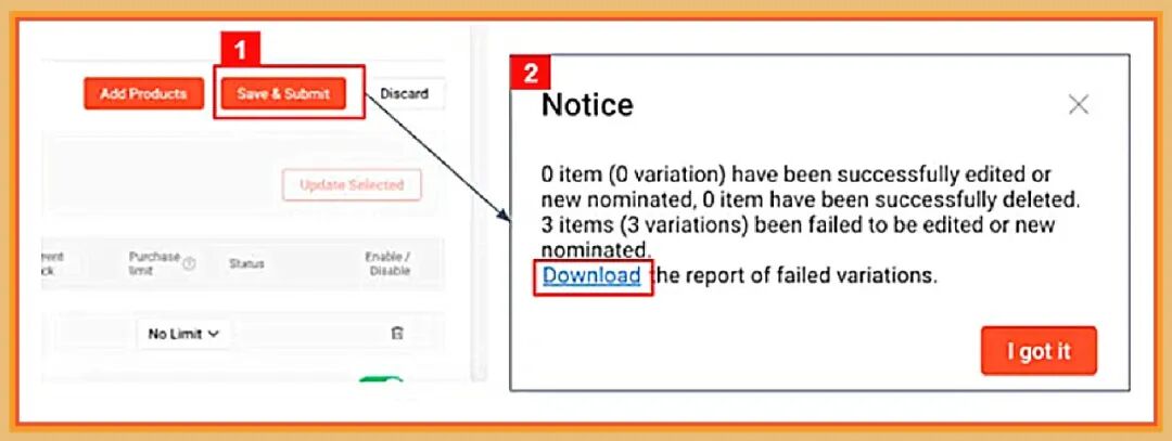 卖家点击“保存”后,系统会弹出提示,卖家即可点击“下载”(Download),查看提报失败原因,从而优化。