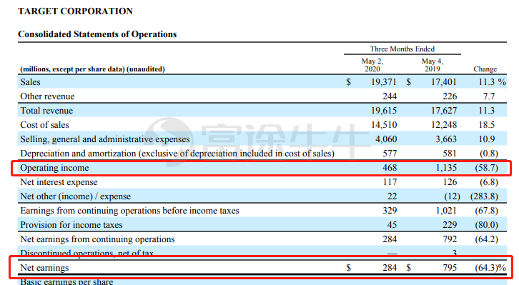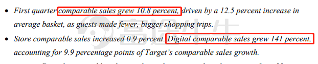 不过,2020年Q1,塔吉特的营收同比增11.3%至196亿美元,超市场预期;同店销售额同比增10.8%,线上同店销售额同比大增141%。