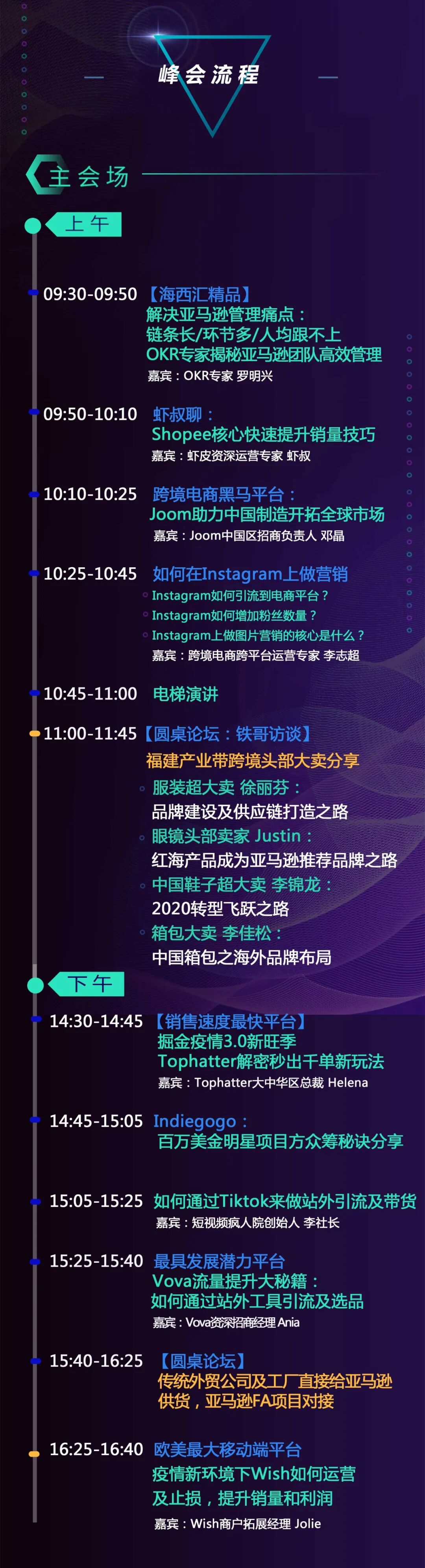2020年跨境大卖究竟如何布局海外市场?他们的品牌成功之路是否有可复制的地方?在峰会现场,我们将邀请到厦门俊亿供应链有限公司创始人徐丽芬、厦门欣维发电子商务有限公司创始人李佳松、华东资深亚马逊卖家Justin和晋江阿雷得鞋业有限公司创始人李锦龙4位福建产业带跨境头部大卖亮相现场,和卖家们面对面畅聊品牌出海和2020年转型之路。 为了决胜旺季,卖家应该提升整体运行效率,控制发货节奏,尝试扩展疫情下需求大幅上升的产品品类。届时,有亚马逊OKR专家罗明兴、Shopee资深运营专家虾叔、Wish商户拓展经理带来平台管理、选品和流量等一站式解决方案,帮助卖家决胜2020年旺季。 随着欧美疫情升级,很多卖家都开始转而投入新市场,挖掘新商机。此次高峰论坛,除了亚马逊、Shopee和Wish等主流平台干货分享,还邀请到Joom、Tophatter、Vova等潜力新兴平台负责人和Indiegogo众筹平台助力卖家开拓全球市场,现场解析旺季选品、引流和爆单玩法。 2020年Tiktok短视频彻底火了,这也给卖家们站外流量带来很大的机会。那么在TikTok红利期如何有效果、有策略的投放?才能让自己摆脱运营困境,一键开启带货狂潮。 根据卖家们的困扰,峰会现场我们邀请到短视频疯人院创始人李社长帮助你提高Tiktok播放量和粉丝增长,揭开从引流到变现卖货的神秘面纱。除此之外,还有跨境电商跨平台专家李志超手把手教你在Instagram投放广告,提升店铺销售。 从2020年开始,国外的订单量就大幅缩减,网交会等展会的客户流量也大大减少,传统企业表现出强烈的转型需求。企业要如何打破传统外贸禁锢转型升级?峰会圆桌论坛,数位传统外贸企业大咖带你突破现状,细说为亚马逊供货和亚马逊FA项目对接那些事,小厂家也有大前景。