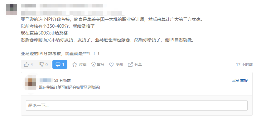 有卖家吐槽:亚马逊IPI考核现在500分才及格,但亚马逊要么是仓库不给发货要么是仓库爆仓,导致卖家断货,IPI自然就低。也有的卖家表示,现在移除订单还会被亚马逊取消!