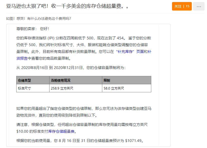 8月10号,亚马逊IPI考核结束,不少IPI分数低于500分的卖家收到了亚马逊关于库存仓储超量费的邮件,但该费用数额之高让卖家诧异不已。