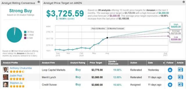 在大多数情况下,其他分析师对此并无异议。在过去三个月发表的39篇评论中,有38位分析师认为该股应该买入,而只有1位认为应该持有。因此,AMZN 是一个强势买入。与此同时,3725.59美元的平均目标价意味着股价在未来一年可能飙升18% 。