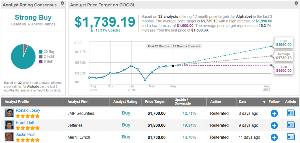 看看市场共识的评级,其他分析师也对此印象深刻。根据30次购买和2次持有评级, GOOGL 获得一个“强力买入”评级。平均价格目标为1,739.19美元,意味着较目前水平有15% 的上行潜力。