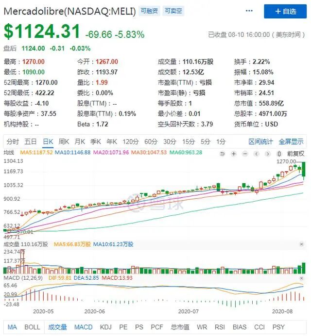 8月10日美股盘前,拉丁美洲的电商巨头Mercadolibre(NASDAQ:MELI)发布截止6月30日的2020年第二季度的业绩报告。财报公布后,股价当日高开低走。截至当日收盘,报于1124.31美元,跌幅达5.83%。