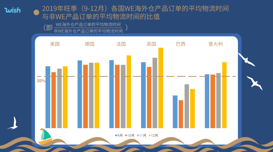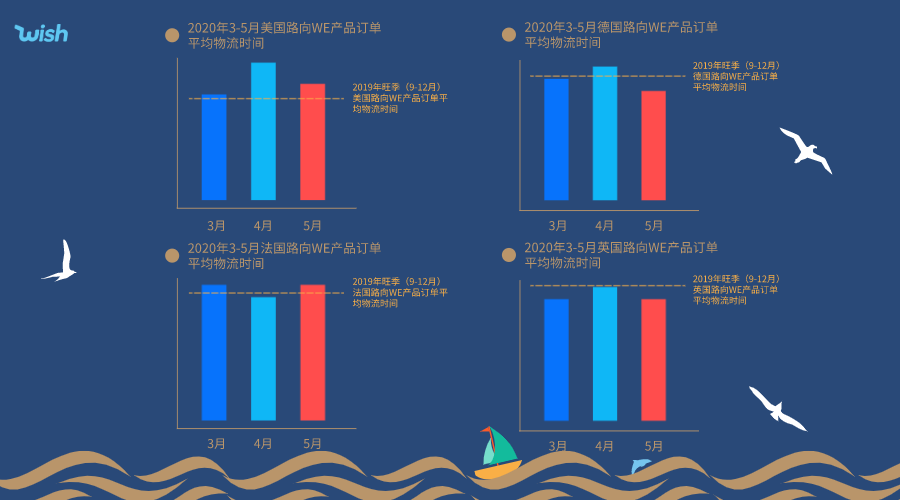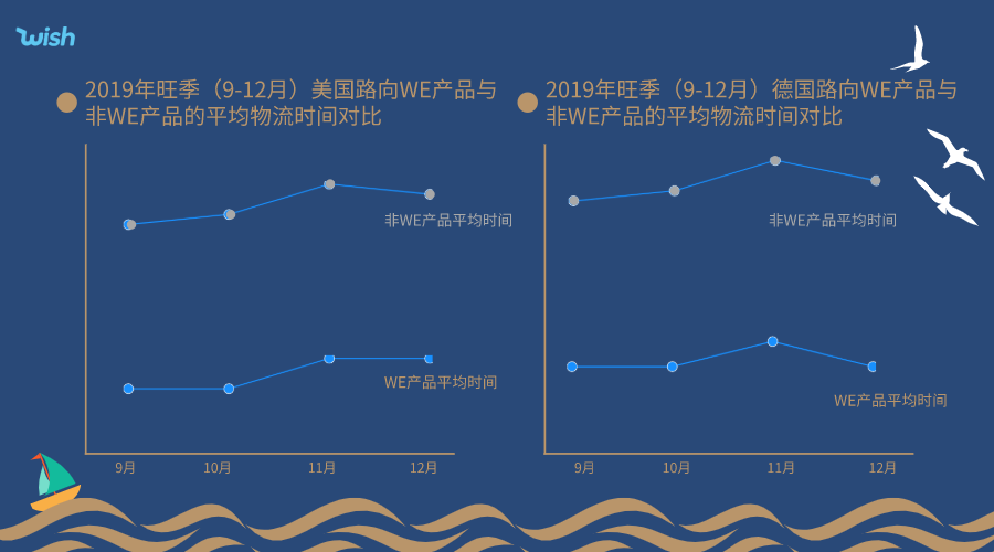 简而言之:从2019年旺季的物流数据来看,受益于海外仓物流的巨大优势,Wish Express海外仓产品订单在旺季的物流时间要明显短于非WE海外仓订单!短得还不是一点点哦~