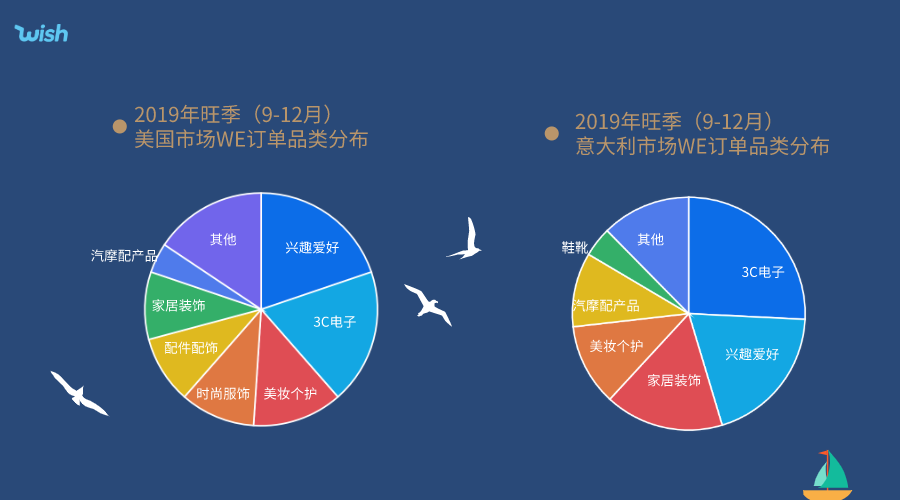2019年旺季期间(9-12月),美国是当之无愧的Wish Express海外仓产品最大的市场,不仅订单量最大,WE海外仓订单占总订单数的比例也是全球最高。紧随其后的是意大利、比利时、德国、荷兰等国。而从排名国家分布来看,美国及西欧地区是Wish Express海外仓产品最重要的市场。