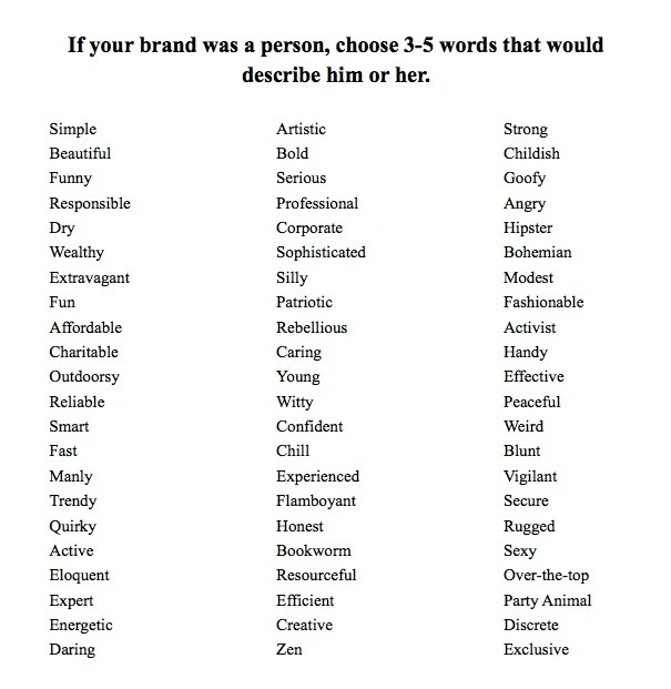 一个有趣且有用的品牌塑造实例是用三到五个形容词来描述你的品牌类型,而且它们最好能够引起你的受众的共鸣。我们特地整理了以下列表帮助你入门: