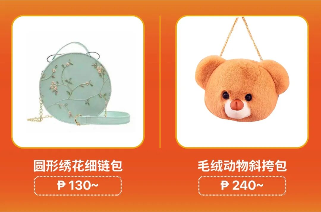 至于包包的版型,可以不用拘泥于长方形或是正方形,一些如圆形或是不规则图形的肩包近来同样也有不错的成绩。而卖家小伙伴们甚至可以选择一些更夸张的设计,例如完全以动物头像来做包,并用毛绒质地来突出视觉感受以及手感。为了将路人的眼神锁定在包上,建议采用很细的金属链带,这样在与较深颜色的上衣搭配后,链条会“消失”,只留下“萌出血”毛绒包包。