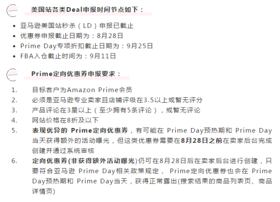 另外,爆料内容对优惠券申报、Prime专享折扣和FBA入仓时间截止做出了时间限定。具体如下:
