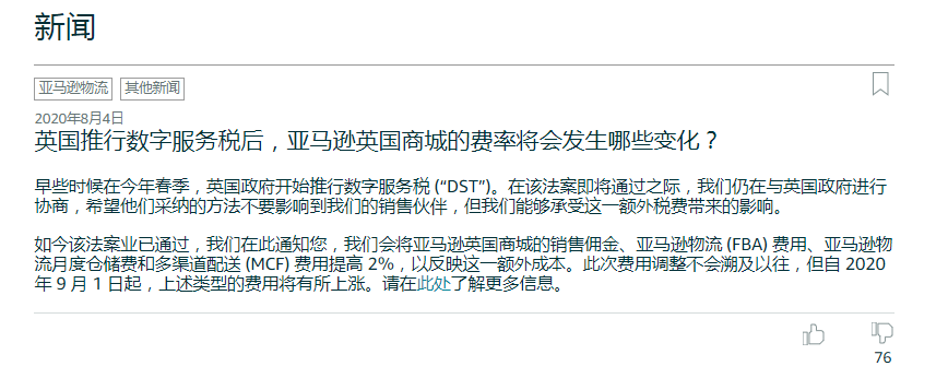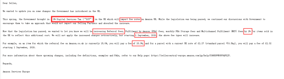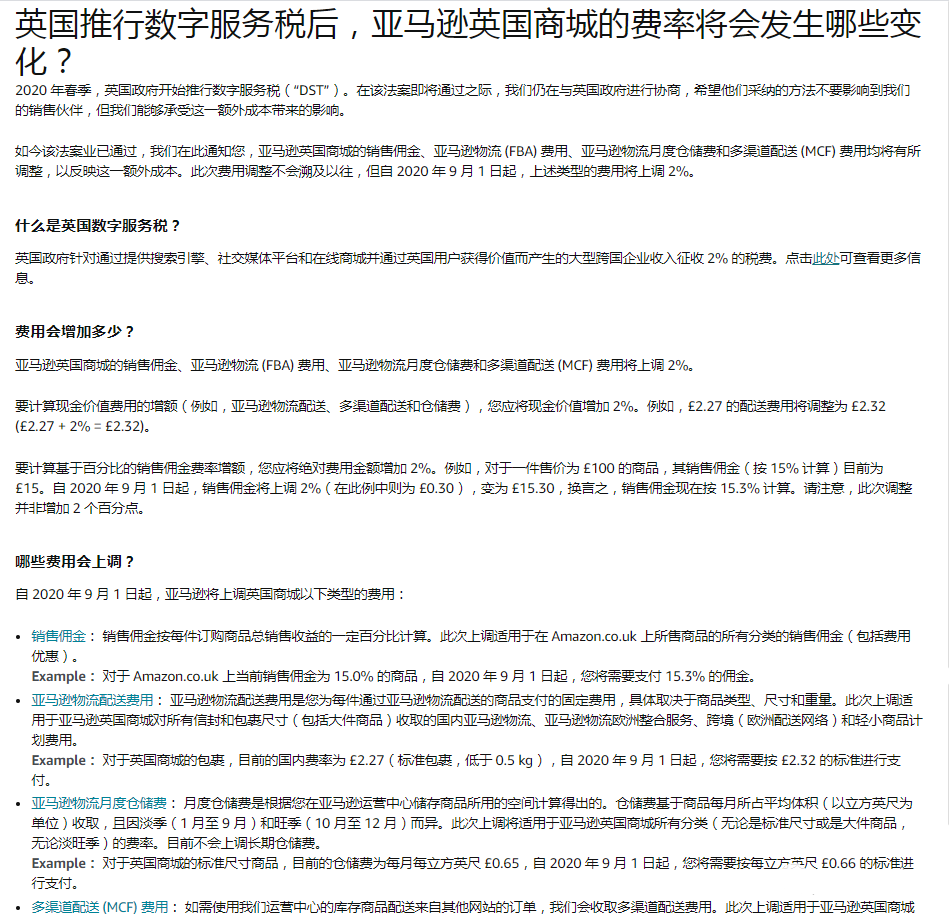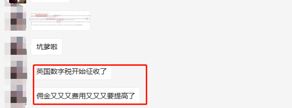 简而言之,英国站卖家在9月1日后的销售佣金、FBA费用和MCF费用都将上涨。其实,早在1月初就有传言称英国将在3月份向科技公司征收2%的税。但当时亚马逊对此并不在意,称其只会将收费转嫁给卖家,尽管它承认这可能会损害小企业的利益。从之前的3月延迟到如今的9月,背锅会迟到,但不会缺席,终究是卖家抗下了所有......对此,有卖家算了笔账:£2.27 的配送费用将调整为 £2.32 (£2.27 + 2% = £2.32)。意味着配送费用占比将增加0.3% - 0.4%,销售佣金也将增加这么多,杂七杂八加起来毛利少了1%,1万英镑的毛利少了100英镑,一年少了1200英镑的毛利。