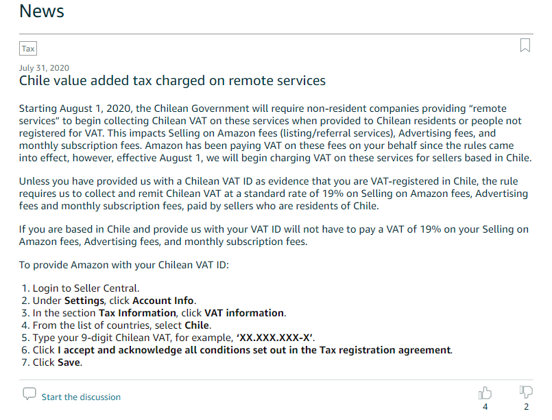 其实除了英国数字税、奥地利增值税引起了亚马逊的政策变动,近期不少美国站卖家也接到需要上传智利税号的通知。亚马逊上周末在后台推送了一则通知表示,智利政府执行了新税务政策,要求亚马逊协助对应税的海外订单进行征税。因此亚马逊会从本月(8月1日)开始,针对所有智利消费者购买的订单开始征税,如果卖家没有当地税号的话就会被按照19%的标准税点扣除税金。