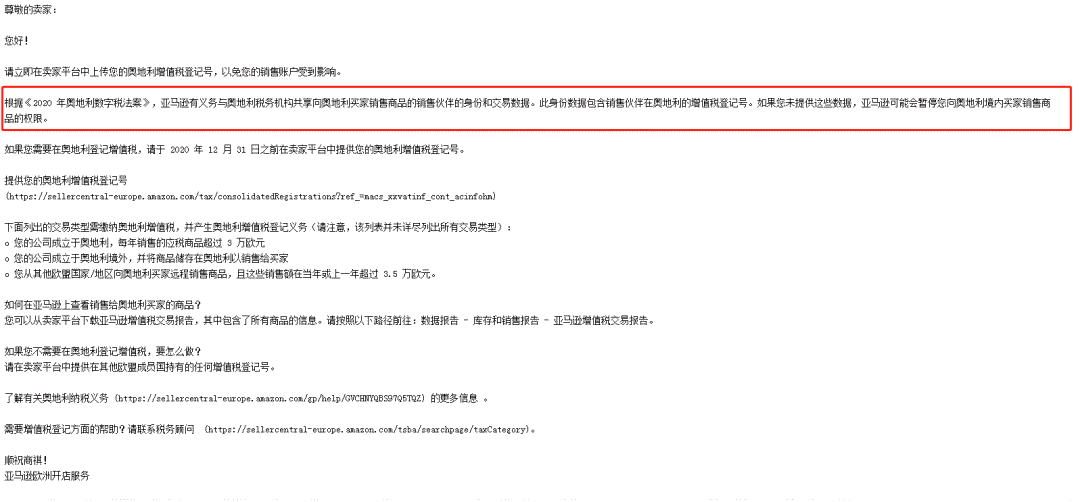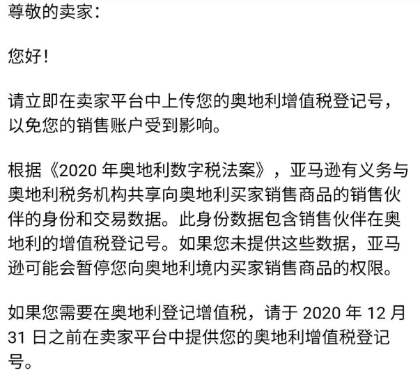 亚马逊邮件中表示:根据《2020年奥地利数字税法案》,亚马逊有义务与奥地利税务机构共享向奥地利买家销售商品的卖家的身份和交易数据。此身份数据包含卖家的奥地利增值税税号,如果您没有提供这些信息,亚马逊可能会暂停您奥地利的销售权限。如果您需要在奥地利登记增值税,请于2020年12月31日之前上传奥地利VAT税号到卖家后台。