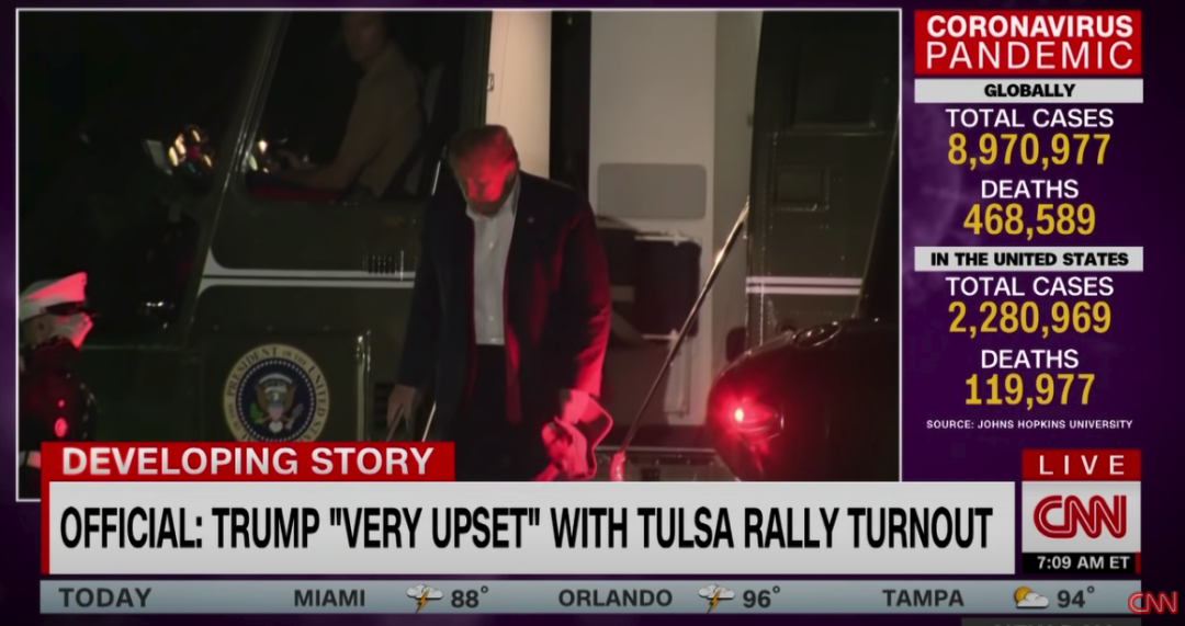 6月20日,特朗普在奥克拉荷马州一所可容纳近两万人的体育馆内,对着稀稀拉拉的观众,站着如喽啰。