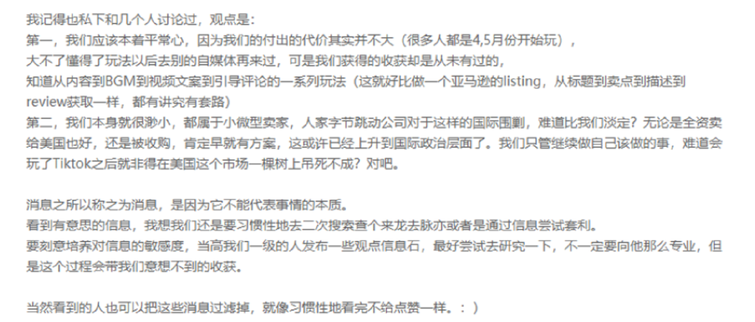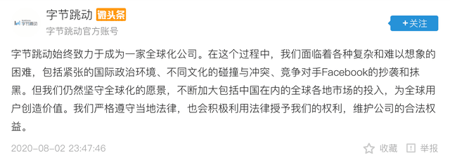 以下为内部信原文: <上下滑动查看> ▼ 很久没有专门给中国同事写信了,上一次还是疫情爆发的时候。今天想就近况,专门和大家聊聊。 又到风波季 因为传公司将出售TikTok美国业务的新闻,很多人在微博里骂公司和我。我看到头条圈里有人说半夜被微博评论气哭,有人替我和人吵架怼到手酸,也很多同事加油鼓励。昨天加班到天亮,睡觉前打开头条圈,看到有人发早上5点半的深圳来福士大楼的照片,属于公司的楼层灯还亮着。 最近很多同事一起努力,震原、定坤和技术部门同事经常工作到半夜进行架构升级、欧洲数据中心建设,还有很多部门同事24小时待命,随时被叫起来工作。感觉不平凡的日子,像一段特别的旅程。 感谢大家 想专门谢谢中国的同事,我心里一直觉得,但第一次说。 说实话,随着公司全球化的发展,不少中国同事牺牲了很多,从16年开始频繁出差外派,或者在中国克服时差语言问题工作,而且常常有许多应急工作。我总是push大家走出舒适区,拥抱变化,强调未来十八个月非常重要。 后来,因为越来越多的岗位本地化,比如TikTok市场运营职能(许多来自base上海的musical.ly团队),非中国业务内容审核等职能从18年底开始全面迁出中国,很多同事干得好好的被调岗。研发同事也因为数据访问政策调整工作受影响。 幸好公司成长得快,大家在新的岗位上发展的也很好。头条圈时不时也有一些抱怨,但总体上大家真的做到了格局大、ego小。 全球公司 作为中国人创立的公司,为什么我们内部经常强调我们是全球公司,大家工作中要有火星视角。因为我们同事来自世界各地,有不同的文化背景,面对不同的舆论场。而每个人都有信息局限性,更容易从自己的角度出发,尤其在地缘政治强化和去全球化的时候经常会出现问题。 不站在火星视角,在工作中会容易无心地冒犯不同国家的文化和价值观,或者把自己的习惯标准强加给不同文化背景的同事,这样的例子非常多。这也是我们为什么把“多元兼容”加到字节范中的一个原因。 文化冲突是大多数中国公司不会遇到的问题。很多中国公司的国际业务主要是实体产品的销售,所以团队保持中国人为主就可以做到业务高效。而我们这样一个连接不同文化的大型平台则必须各国的团队来运营管理。我们在各个国家尊重当地文化,所以能吸引不同国家的人才加入字节跳动,经过2-3年的曲折,在很多国家我们都建立了很好的雇主品牌。我觉得这也是格局大,ego小的体现。 社交媒体上的舆论 我其实很理解,人们对一家中国人创立走向全球公司有很高的期待,但是没有很充分和准确的信息,加上民众对当前美国政府很多行为有怨气,所以容易对我们有特别激烈的批评。 只是多数人把这次事件问题的焦点搞错了,问题焦点根本不是CFIUS以musical.ly并购危害国家安全为由强制TikTok美国业务出售给美国公司(这虽然不合理,但仍然是在法律的程序里,作为企业我们必须遵守法律别无选择),但这不是对方的目的,甚至是对方不希望看到,其真正目的是希望全面的封禁以及更多... 复杂的事情在一定时期并不适合在公共环境中说。就像过去也有很多时候,对公司的批评我们并不能展开解释,大家一同经历之后对管理团队有更多的信任。对于公众的意见,我们要能接受一段时间的误解。希望大家也不要在意短期的损誉,耐心做好正确的事。这也是格局大,ego小。 反华情绪的挑战 过去两年以来,尤其是最近,很多国家反华情绪上升明显。 举个例子,4月份我们印度公司对印度医护人员做了防护物资捐赠,6月份中印冲突升温后,努力协助我们运输和完成捐赠的印度妇女儿童部部长在社交媒体上被网民大量攻击。 少在短期内形成了一定的氛围,乃至有更全面视角和中肯看法的人也不能公开说公允的话。所以我们也要特别理解非中国员工的处境,也要预计未来有更多的困难。 尽管如此,我们还是应该从长远的发展来看眼前的挑战和压力。不断追求好的产品体验,建设好的团队文化,透明开放,以及在保护用户利益和企业社会责任方面追求高标准。我相信不但能赢得用户,也能为中国企业加分。 偶尔也有人说,公司对中国团队要求得更多一些,我觉得目前确实是,特别谢谢大家一起努力。 一鸣