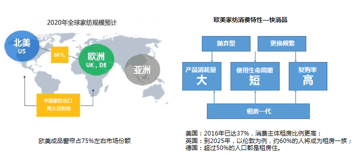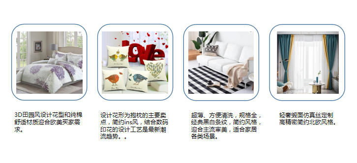 产品策略—家纺,全球家纺2018—2024年复合增长率为5.5%,2020年全球家纺规模预计达$1300亿。
