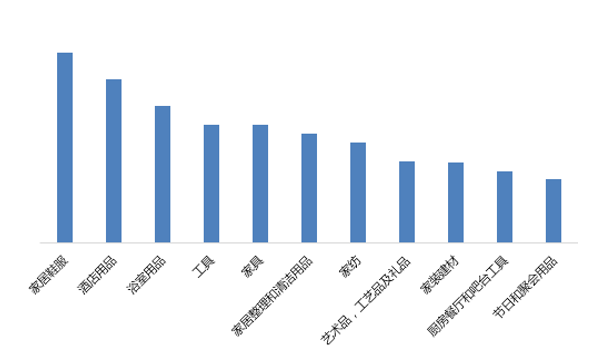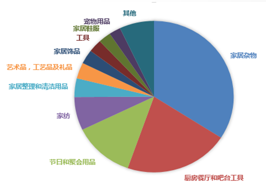 占比TOP5:家居杂物、厨房餐厅&吧台工具、节日聚会用品、家纺及家居整理&清洁用品。