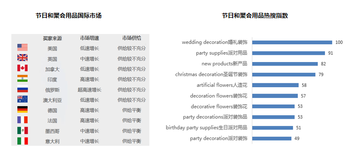产品策略—节日和聚会用品,节日和聚会用品的核心市场是美国,其次是英国和加拿大。