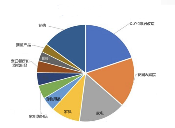 全球家居市场,DIY和家居改造占比20%;花园&庭院占比18%;家电占比15%,家具占比10%,宠物用品占比5%,家纺占比5%,烹饪餐厅和酒吧用品占比5%。