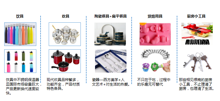 产品策略—厨房餐厅和吧台工具,重点招募:饮具、烘焙用具、烹饪用具、厨房小工具和餐具。