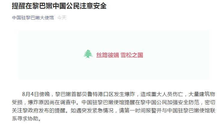 北京时间今天凌晨3时许,中国驻黎巴嫩大使馆也发布消息,提醒在黎中国公民加强安全防范,密切关注黎政府发布的提醒。如遇突发紧急情况,请第一时间报警并与中国驻黎巴嫩使馆联系寻求协助。