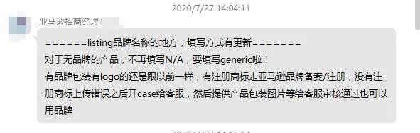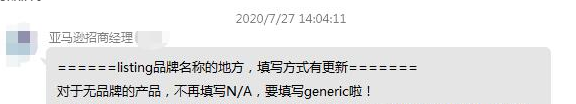 此外,还有卖家发出截图,图中亚马逊招商经理直接表示:对于无品牌的产品,不再填写N/A,要填写 generic啦!