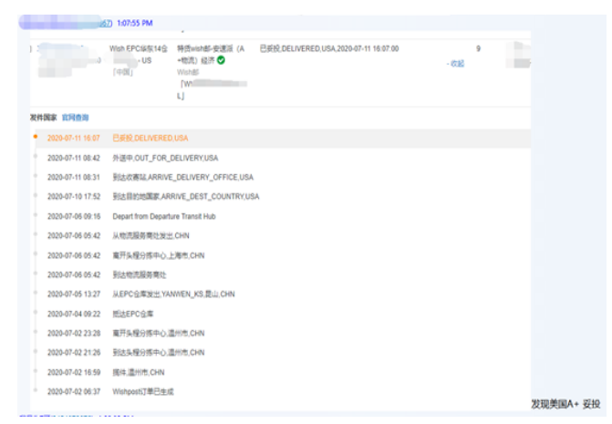 不过,近期不少跨境卖家反映Wish A+美国的订单已经能看到妥投状态,让人颇为惊喜。温州一卖家表示,其7月初使用 A+ “安速派经济”寄出的订单在11日就送达消费者手中,另一位深圳卖家寄出的包裹也在16日显示妥投。