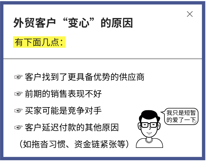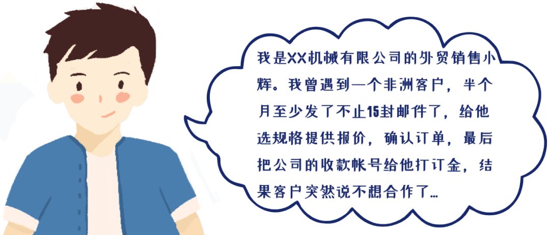 相信这样的场景很多外贸人都经历过。 对于这种情况,我们应该先分析一下客户突然“变心”的原因,如果解决了客户所顾虑的问题,帮助客户创造额外价值和利益,他自然就会下单了。 在了解客户“变心”的心理之后,接下来就应该在客户悬而未决的时候,主动出击,要催。但是,催单要掌握技巧,我们针对以上种种心理并结合实例来总结出对应的解决策略。 买家找到了更具备优势的供应商 客户找到了更心仪的供应商,这种情况的失单概率最大。 我们此时不能直接去降价催单,要先去了解对方的业务及优劣势,尽量短时间内做一个充分的调研。 然后再利用价格之外的优势抬高产品,商场如战场,只要自己的产品过硬,就要有自信,不能自乱阵脚。告诉客户我们能够给他带来什么价值,有什么售后服务等,此时考验的是业务员及时、准确、全面、专业、客观的答复。 接着我们就要提供有竞争力的报价,这也是达成交易的关键。他之所以认为我们企业的产品“价格高”,是在与哪家企业产品进行比较: 如果客户拿我们的产品与大企业的产品相比,就应向客户说明两者的价格是不能相提并论的,因为品牌的知名度和市场定位都不一样。 如果客户同竞争对手的产品相比,首先应将客户所说的竞品价格和售卖情况调查清楚;然后对号入座,看看竞品相当于我方产品的哪个品类;最后向客户说明他是在拿低档竞品的价格比我方高档产品的价格,对我方显然是不公平的。 前期的销售表现不好 客户会“变心”,除了理性上的利益关系,还是会受到感性方面的影响。如果前期客情关系处理的不是很好,也是会导致客户后期与你中断合作,所以接下来应把工作重心放在沟通上。 对于这位非洲客户,我们要了解非洲的文化和风俗,给自己多点谈资、打打感情牌。但要注意的是,有些话题不要提及,例如不要讨论白人问题,不要非议黑人的古老习惯,不要评论黑人部落间的矛盾等等。 还可以投其所好,如非洲人对价格要求比较低,产品质量要求不高,但是每次走货的量比较大,喜欢物美价廉的东西。所以我们可以有技巧的让利,最好是帮他们计算好利润,让他们有利可图。 如果你们公司会经常到当国出差、参展,这也是个非常好的伏笔,可邀请客户到展位,这一技巧的成效很高,和客户见过面,让客户知道你是个有血有肉的人,不是台冷冰冰的机器,能进一步加深关系。 买家可能是竞争对手 装扮成外国客户来刺探你的价格,交易条款等信息,询盘专业,很难分辨。 如果是网站渠道来的询盘,可通过在网站上安装的统计分析工具,查询到这个人的IP地址,是否来自国内哪个地区;也可以通过多次往复的交流,经验评估,建议尝试和买家进行电话沟通,如果对方拒绝提供电话或传真,那么十有八九是假询盘。 在没有证据的情况下建议继续以对待客户的态度对待假询盘,不管成交与否,都不能一票否决。 但要避免暴露过多商业信息,尤其是对机械类产品关键部件只报性能,不报规格。心态可以放轻松,但别抱太大的希望,也没必要将事情戳穿,更不要有反面情绪。作为外贸人,必须怀着一颗高度警惕的心,还要有容纳万事的胸襟和看淡这些行为。 客户延迟付款的其他原因 (如拖沓习惯、资金链紧张等) 拖沓习惯: 非洲客户做生意的习惯就是非常拖沓,对于这类客户,一方面我们可以告诉他制作原料已经买好了,现在等客户的定金一到就可以马上生产了,这是一种委婉的催促方法。 另一方面可营造原材料涨价的假象,国外客户对国内的市场行情了解比较少,可告诉客户如果现在不下单,马上要进入旺季了,价格可能会上涨,交期要延长。 资金链紧张: 外贸很多客户都是中小采购商,客户的资金链紧张也是常见的问题,在这个非常时期我们更要给予理解,此时催单一定要沉着耐心,不可操之过急。 如果客户资金链紧张的借口超过了一个月,我们可以利用节假日催单法来跟进:和客户说某某节假日要来了,提醒一下客户节前的货运和快递都很紧张,让客户心理有数,是否要在节前采购,是不是要赶在节假日之前能够出货,制造出一种紧迫感。 另外还可以结合节假日的促销活动,降价打折,让客户感觉到现在下订单更划算。尤其对这种有占便宜心理的非洲客户来说,是个很好的催单技巧。