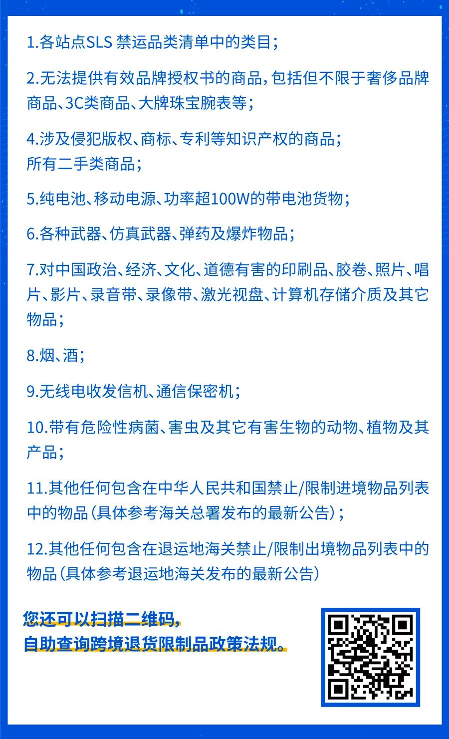 退货时,卖家应对货物申报信息的真实性、准确性及完整性负责。各个站点均对跨境退货品类有所限制,下图列出部分限制品类供各位卖家做退货参考。