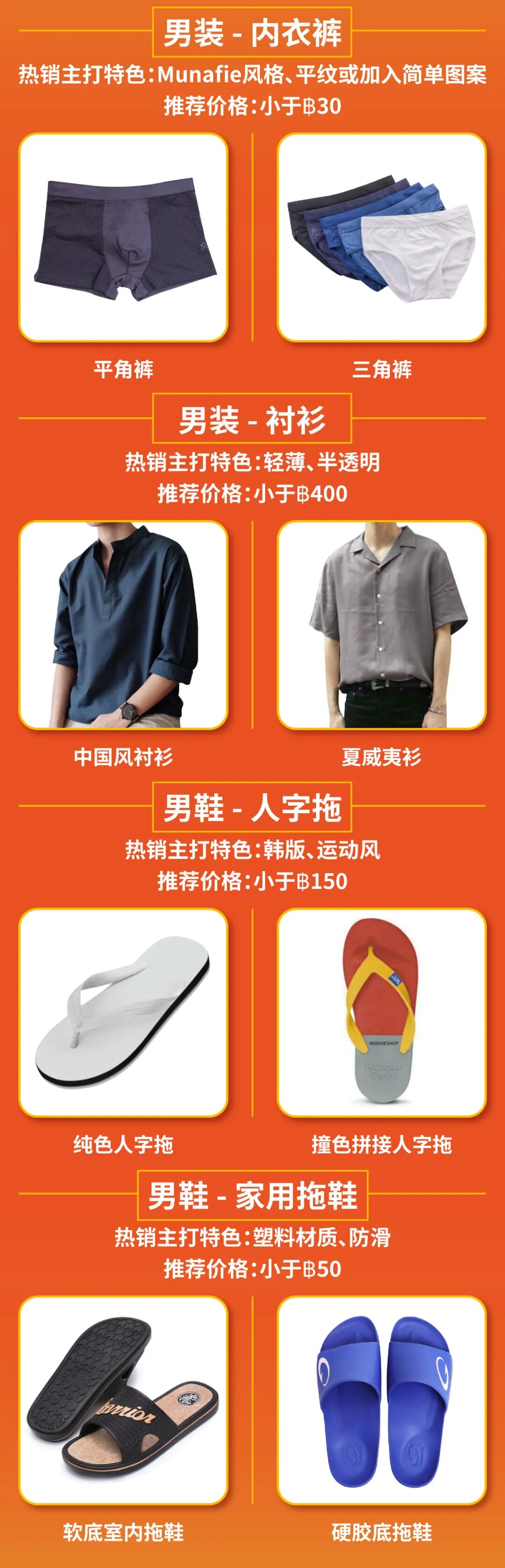 泰国当地男性夏季时尚趋势偏运动休闲风:平角裤、轻薄款外套、运动人字拖等,简单清爽之余还得突出实用好穿。要博得男性消费者的眼球,重视产品质感的同时,价格更是绕不开的话题:高性价比的商品更能在同质性较强的男性类目中脱颖而出。各位卖家在上架相关商品时,注意把控价格。
