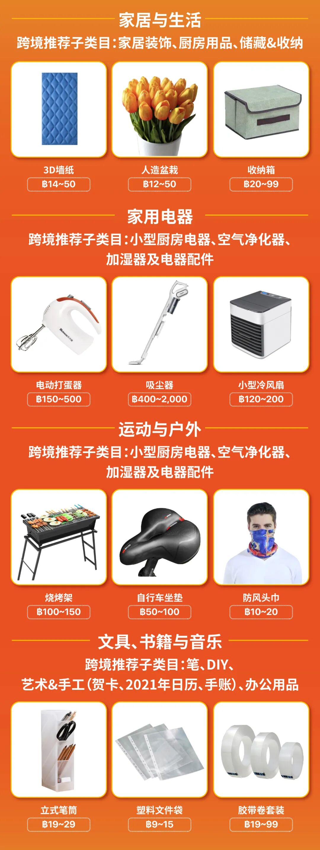 生活相关品类一直是节日或是大促期间,泰国站点消费者浏览量的前几位品类,下半年生活方向爆单商机满满!因疫情原因,各类家居生活用品热度始终不减,依旧是上架的好选择!但随着居家令的逐渐放宽,户外用品开始势起:露营设备、自行车配件、运动服等有很好的回暖趋势。同时,文具及艺术用品、书籍、还有办公用品这些礼物必备选项,自然得列入节日季和大促活动的上架清单中!
