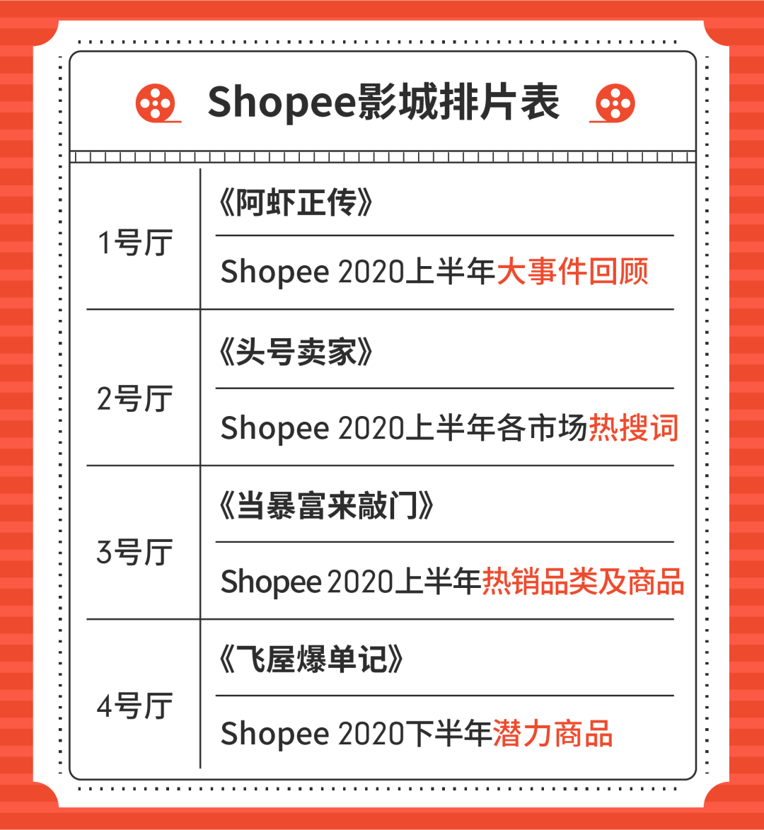 疫情爆发后第6个月,全国影院重启。今天“Shopee影城”也重磅开业,为你独家放映4部大电影,一起回顾2020上半年大事件,首次揭秘热搜榜,发布热门品类及产品,更有近期市场热销趋势分享。