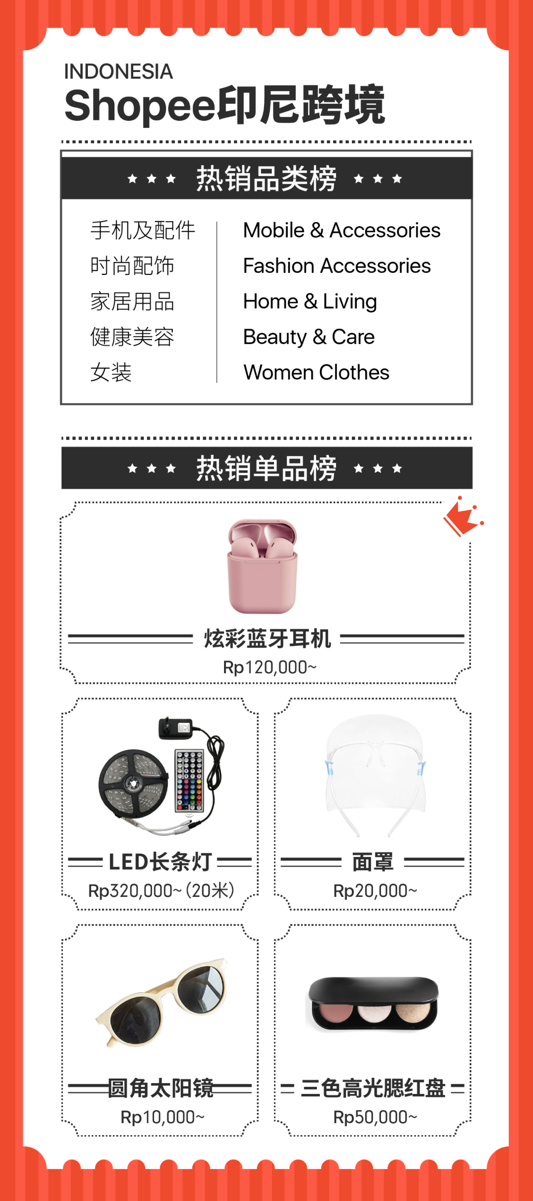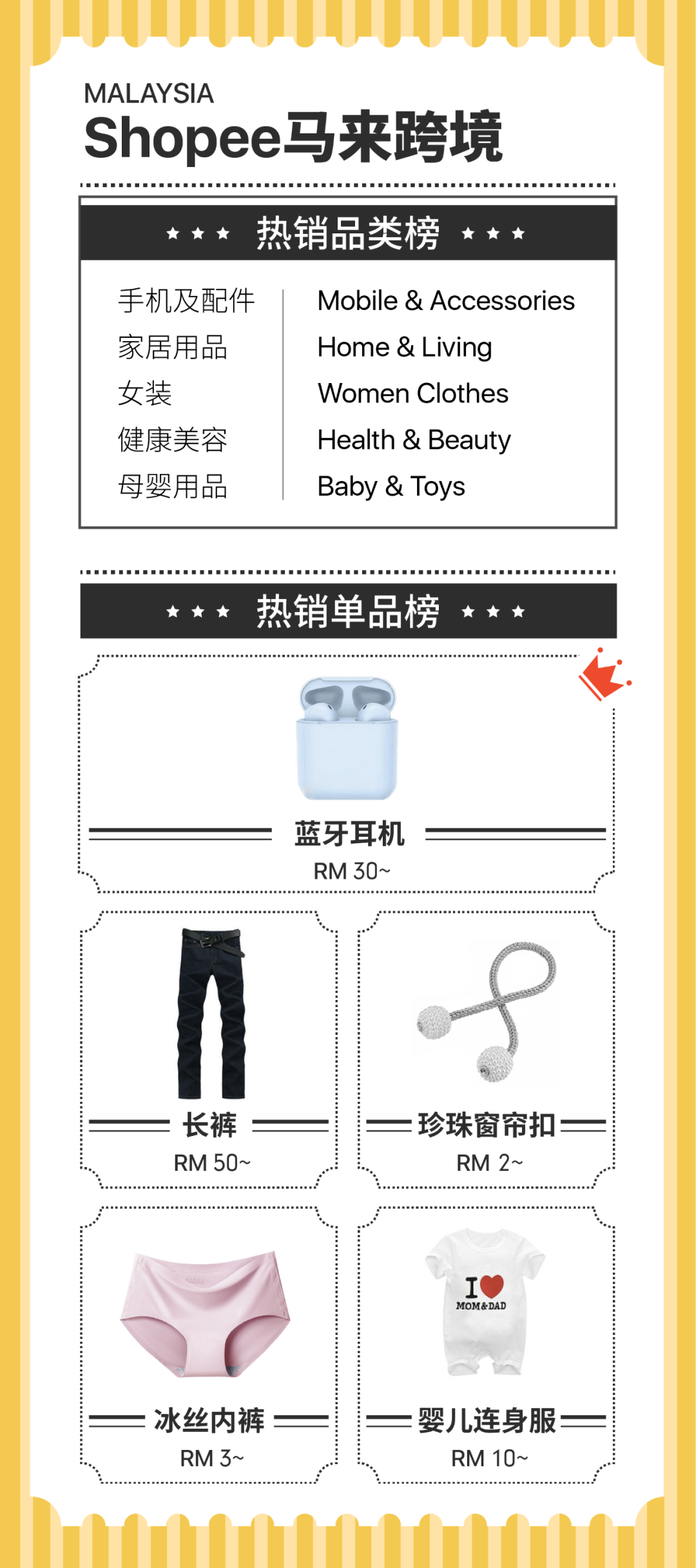 Shopee跨境上半年热销品类及商品榜也重磅发布!印尼、马来、台湾、菲律宾市场热销资讯,某类商品甚至霸榜3个市场?快来看,为下半年上新寻找灵感,让暴富更快来“敲门”。