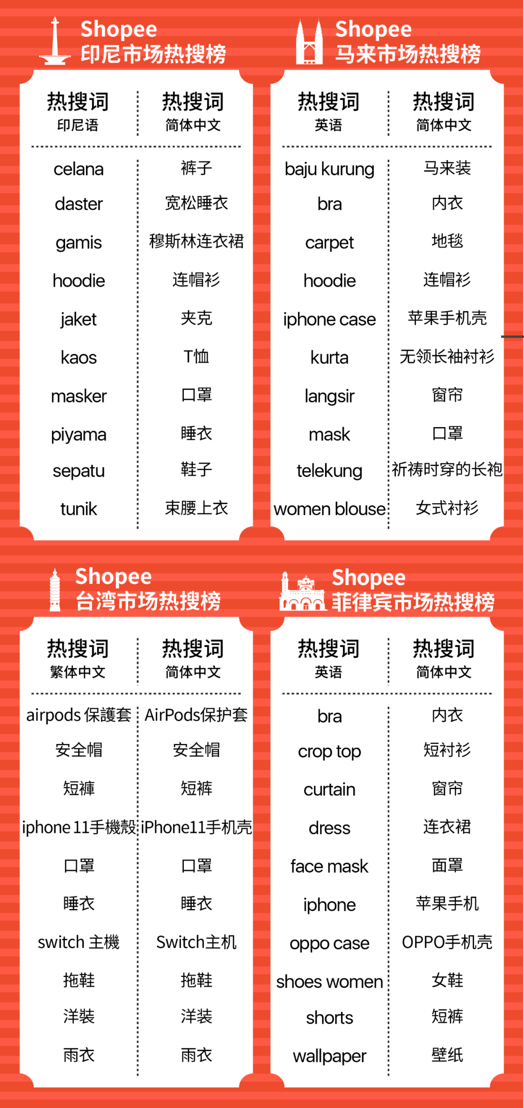 看完大事件回顾,Shopee接下来为大家献上数据干货:2020上半年四大市场热搜词首公开!今年,疫情新消费场景创造了新需求:防疫周边、家居用品等成大热搜。细品以下词汇,你就是Shopee“头号卖家”,找到“彩蛋”,成功冲关,走向爆单!