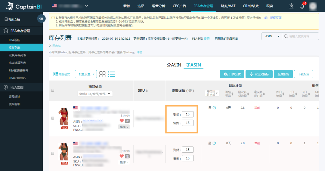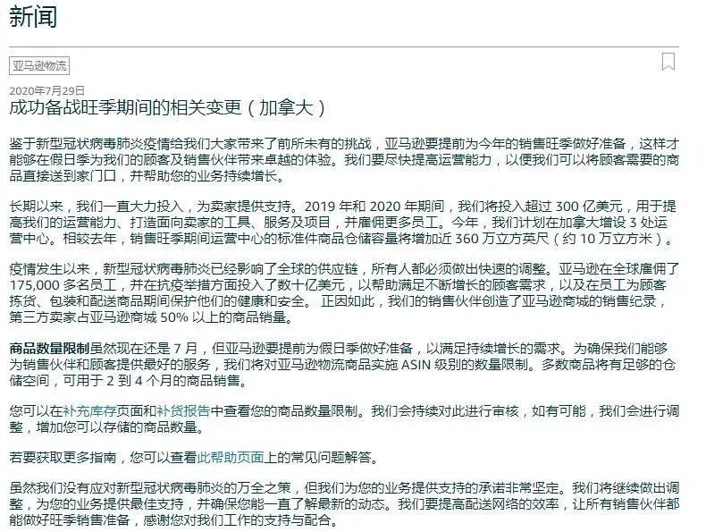 亚马逊FBA商品实施入仓数量限制 库存绩效指标分数(IPI)的达标值调整为 500(考核期:2020年7月13和8月10那周) 2020年7月14日起,免除卖家移除订单的费用 亚马逊FBA商品实施ASIN级别数量限制 库存绩效指标分数(IPI)的达标值调整为 500(考核期:2020年7月27和8月24那周) 欧洲站:从2020年7月24日起,免除卖家移除订单的费用 日本站:从2020年7月22日起,免除卖家移除订单的费用 亚马逊FBA商品实施ASIN级别数量限制 图源/亚马逊加拿大站后台 一石激起千层浪,这些政策相继发布后,引发无数讨论!有卖家提出争议,也有卖家表示疫情期间能够理解。不惊喜也不意外,今年旺季注定会很“艰难”! 面对这些问题,接下来的Prime Day 和Q4旺季卖家该如何破局,把控好运营成本的同时提升运营效率,以争取最大化利润? 与三月份亚马逊限制非必需品入库不同,这次,所有FBA商品都有数量限制。亚马逊表示,多数商品将有足够的仓储空间,可用于3个月以上的商品销售。 确定自己能够发送多少库存 登录卖家平台在「补充库存」或「补货报告」页面,查看商品目前的数量限制和可发货数量。点击每个ASIN对应的「供货天数」,即可查看最大货件数量。 对于多店铺的卖家,你可以直接在船长BI「FBA库存管理」模块下的「FBA看板」中查看你所有店铺当前的库存状态。 点击图片查看大图 其中,补货相关的包括: 可售 在途 总库存量 预留库存 不可售 是否当前补货 可售天数 建议补货 建议补货时间 需补货SKU数 需补货成本 各项数据一目了然,无需一个个店铺登录切换查看,可以很大程度上帮助你节省时间成本。 提早做好备货准备及补货计划 根据亚马逊官微的建议,热销商品要及时补货,销量不好的商品可以降低库存,不需要补货的商品,点击「隐藏建议」。 图源/亚马逊后台 如果你的热销库存没有及时补货,可能会出现断货风险,对你的IPI分数也会有影响。建议每周或每两周下载库龄报告,重点关注你的销量排名前10的ASIN是否需要补货。 对于不需要补货的商品,选择「隐藏建议」,则系统会将该ASIN从亚马逊FBA有存货率的计算中排除,不会影响你的IPI分数。 你可以使用船长BI「FBA库存管理」模块下的智能补货功能,在「FBA看板」设置好到货和备货天数,系统会通过数据分析的结果,提示商品的可售天数和建议补货数量,提醒你什么时间段需要补货,大大提高你的运营效率和库存周转。 点击图片查看大图 为了满足不同公司/卖家的不同补货场景,还可自定义设置关键指标的计算公式: 亚马逊官方公布的允许发送的最大货件数量计算公式: 你的最大货件数量 = 允许的最高库存水平 - 库存限额使用量 结合自配送和海外仓进行发货 亚马逊限制卖家补货数量,影响最大的主要是新品,有资深卖家建议,现阶段: 新品推广可以先缓一缓,避免订单上涨过快导致发货量暴增从而达到限制,影响到自身的绩效 对于急于推广的新品的,可通过海外仓中转代发,或者选择靠谱的、时效性好的自配送渠道。 旺季即将来临,卖家目前的库存量是否能满足旺季需求需要好好衡量一下,如果不能满足,后续可以考虑采取自配送和海外仓的备用计划。 首先,我们先来了解下影响IPI分数的几个因素,登录卖家平台,在「库存绩效控制面板」中即可查看影响IPI分数的主要因素: 冗余库存百分比 亚马逊物流售出率 无在售信息的亚马逊库存百分比 亚马逊物流有存货库存 图源/亚马逊后台 减少冗余库存 主要排查库龄超过365天的商品,这些商品会产生长期仓储费,减少此类商品不仅有助于提高IPI分数,也可帮助降低仓储费。 登录卖家平台,访问「亚马逊物流库龄」页面,筛选出库龄超过365天的商品,根据页面右侧的操作建议,采取相应措施。 针对这一问题,船长BI紧急上线了「冗余提醒」功能,在「FBA库存管理」模块下的「冗余库存列表」中进行设置。 点击图片查看大图 在此页面,你还可以直接筛选所有店铺库龄超过365天的商品,并支持生成和下载报告,方便你进行分析和统计。 与此同时,船长BI手机微信端也同步上线了该功能,点击微信菜单栏「异常数据诊断」即可看到,如有冗余库预警,船长会第一时间在微信通知到你。 提高售出率 优化好你的Listing,有必要的话再调整一下广告投放策略,也可以创建清仓促销,捆绑搭配商品进行销售,如果有符合 Outlet Deal(清仓促销)的商品,你还可以参加该促销活动出售你的产品。 再有,就是降价销售,或者创建移除订单,利用「免费移除」限时促销活动,节省移除费。 修复无在售信息的亚马逊库存 定期检查因Listing问题造成的滞销与无在售信息的库存,访问「修复无在售信息的亚马逊库存」页面,根据页面右侧提示进行操作即可。 图源/亚马逊后台 避免出现无在售信息等更多内容,你可以访问以下页面获取帮助: https://sellercentral.amazon.com/inventoryplanning/stranded-inventory(复制到安全的浏览器环境打开) 保证热销商品有存货库存 在前文中,我们也有提到,你需要保证自己的热销商品有货,同时减少为销量较低或没有什么利润的商品补货数量,这样才不会让你的IPI分数受到影响或降低。 限制补货数量和上调IPI分数都是亚马逊临时作出的变更,后续是否还会有其他问题目前未知。 总而言之,卖家们要多关注亚马逊官方政策动态,以便及时进行策略调整。以上方法仅供大家参考和交流,有任何问题欢迎留言补充。![]()