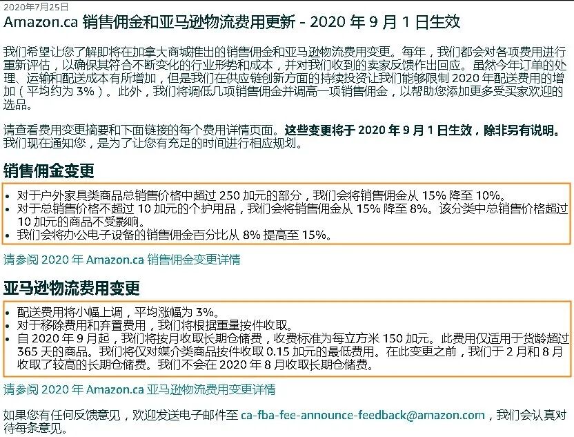 7月25日,亚马逊加拿大站发布公告通知卖家,平台将对销售佣金和亚马逊物流(FBA)费用作出新的变更。亚马逊表示,现在通知卖家,是为了让卖家有充足的时间进行相应规划。 图源/亚马逊加拿大后台 船长获悉,亚马逊在这次变更中将调低几项销售佣金并调高一项销售佣金,以帮助卖家添加更多受买家欢迎的选品。这些变更将于 2020 年 9 月 1 日生效,除非另有说明。 01 销售佣金变更 户外家具 自 2020 年 9 月 1 日起,户外家具商品将纳入“家具”分类中,因此对于总销售价格中超过 250.00 加元的部分,销售佣金将从 15% 降至 10%。 个护用品 自 2020 年 9 月 1 日起,个护用品将纳入“个护健康”分类中,因此对于总销售价格不超过 15.00 加元的个护用品,销售佣金百分比将从 15% 降至 8%。对于该分类中总销售价格超过 15.00 加元的商品不受影响。 电子办公设备 自 2020 年 9 月 1 日起,电子办公设备将纳入“办公用品”分类中,因此对于办公电子设备的销售佣金百分比将从 8% 提高至 15%。 电子办公设备包括打印机、投影仪、碎纸机、扫描仪、计算器、固定电话、复印机、传真机、录音机、电子参考设备、收银机、条形码扫描仪和 VoIP 电话等基础设备。电子产品配件的销售佣金适用于电子办公设备的配件商品。 Ring配件 自 2020 年 9 月 1 日起,Ring配件将纳入“亚马逊设备配件”分类中,该分类的销售佣金百分比为 45%。 02 亚马逊物流(FBA)费用变更 配送费用:小幅上调,平均涨幅为 3% 以下费用价目表显示了当前最新的配送费用及生效日期: 图源/亚马逊加拿大后台 移除和弃置费用: 根据重量按件收取 以下费用价目表显示了当前最新的亚马逊物流移除和弃置费用及其生效日期: 图源/亚马逊加拿大后台 长期仓储费:按月收取,每立方米 150 加元 此费用仅适用于货龄超过 365 天的商品。我们将仅对于媒介类商品按件收取 0.15 加元的最低费用。在此变更之前,我们于 2 月和 8 月收取了较高的长期仓储费。2020 年 8 月我们将不再收取长期仓储费。 以下费用价目表显示了当前最新的长期仓储费用及生效日期: 图源/亚马逊加拿大站后台 二 美国站:启动印度业务,吸引百万买家 7月29日,亚马逊发布消息称,现在卖家可以将业务拓展到印度,让数百万买家了解你的商品。 图源/亚马逊美国站后台 要启动印度的销售业务,卖家需做好以下准备: 检查是否符合在印度开展销售业务的条件,并在卖家平台中设置账户 交叉发布现有选品 通过卖家自配送模式自行配送订单 Tips:在印度销售商品无需支付月服务费。 查看你是否符合在印度销售商品的条件: https://sellercentral.amazon.in/gp/help/external/H3QL6QJCPN56AJ7?ref=nslp_all_7061646377448000080_nslnk_1(复制到安全浏览器环境下打开) 三 欧洲站:夏末促销活动申请通道已开启 7月28日,亚马逊宣布欧洲站2020夏末促销活动的申请通道已开启。船长了解到,亚马逊欧洲5个站点都将参与此次夏末促销活动。亚马逊表示,买家将能通过电视和广播,平台主页和今日促销页面(Today’s Deal), 新闻稿,出版物,邮件等多种形式看到活动信息。 欧洲站点夏末促销活动具体时间安排: 图源/亚马逊全球开店 卖家可提报的促销类型和需满足的条件: 图源/亚马逊全球开店 Tips: 欧洲站夏末促销活动的提交窗口将于活动开始日期的前两周关闭。建议至少在Deal活动开始前72小时入仓FBA。 卖家可以在后台的促销管理面板中查看活动是否有夏末促销的相关推荐,如果符合促销要求,满足条件的话,可以准备起来了。 四 美国站和墨西哥站:即将清点长期库存费 7月24日,亚马逊向使用亚马逊物流(FBA)完整配送服务的卖家发出提醒:即将进行长期仓储费库存清点。亚马逊物流 (FBA) 计划的下一个长期仓储费库存清点日期是8月15日,届时未从亚马逊设施中移除滞销库存的卖家将产生附加费。 美国站公告原文如下: 图源/亚马逊美国站后台 01 美国站 8月15日,亚马逊将对卖家已在美国运营中心存放超过 365 天的库存按每立方英尺 6.90 美元或每件商品 0.15 美元的标准(以较大值为准)收取长期仓储费。 02 墨西哥站 8月15日,亚马逊将对卖家已在墨西哥运营中心存放超过 365 天的库存按每立方分米 3.48 墨西哥比索或每件商品 2.32 墨西哥比索的标准(以较大值为准)收取长期仓储费。这些费用包含增值税。 该政策面临的一个挑战与即将到来的假日购物季有关,如果卖家在下一个库存清点日将需要缴纳长期仓储费的ASIN移除,那么在接下来的三个月内,他们将无法再送进更多ASIN,除非卖家的ASIN库存低于亚马逊未来八周的销售预期。 五 提醒:Listing不符合规定将被屏蔽 7月29日,亚马逊发布公告通知卖家,在刊登listing前确保符合亚马逊的政策规定,以满足亚马逊的产品属性要求。 图源/亚马逊卖家论坛 亚马逊指出: 对于产品描述和要点,请勿出现你的姓名、电子邮件地址、网站URL、公司具体信息、有关你销售的另一产品的详细信息,或诸如“sale(销售)”或“free shipping(免费送货)”之类的促销语言。 亚马逊已经开始禁止在其平台上发布违反产品详细信息页面政策和卖家行为准则的产品。如果ASIN因违规被禁止,亚马逊将会向你发出通知。 六 中国卖家用种子刷单遭美国多部门调查 7月27日,《华尔街日报》的一篇报道在跨境圈被疯狂刷屏。该报道指出,美国人收到神秘种子包裹,大部分来自中国”。这些包裹被指与中国跨境电商卖家有关